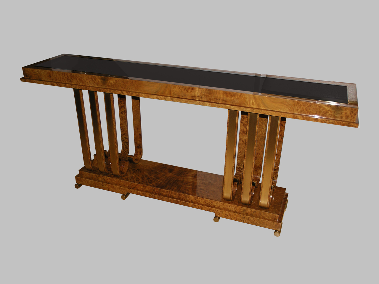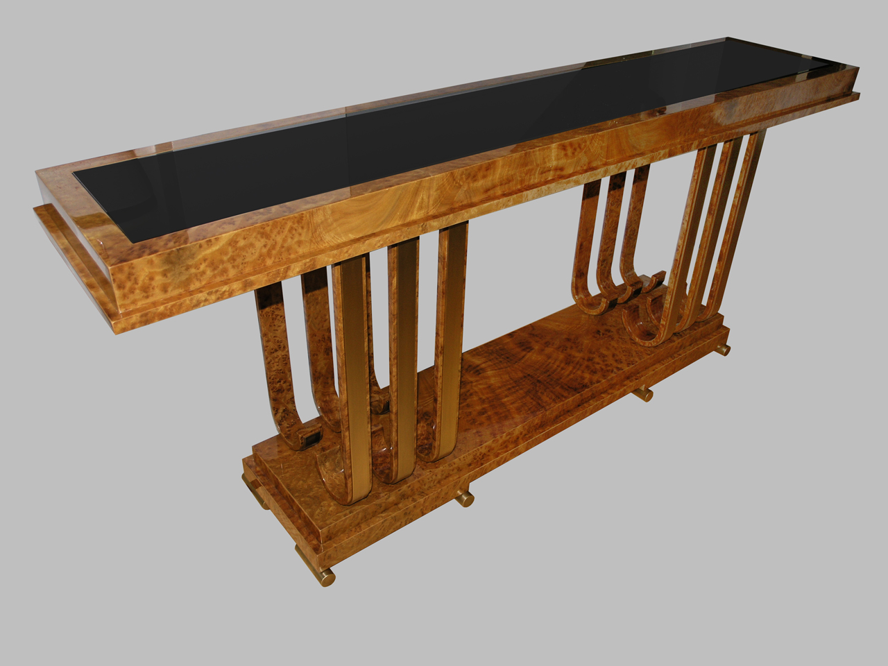 This original Art Deco inspired piece features Carpathian Elm Burl in high gloss Polyurethane with custom bronze metal detailing and a black reverse painted glass inset top.