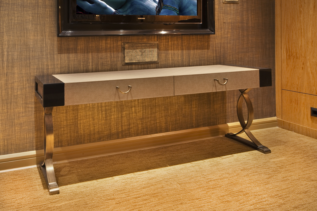 Shark Skin, Lacquer and Bronze Console with drawers detailed with custom made handles, and ottomons for additional seating and comfort.