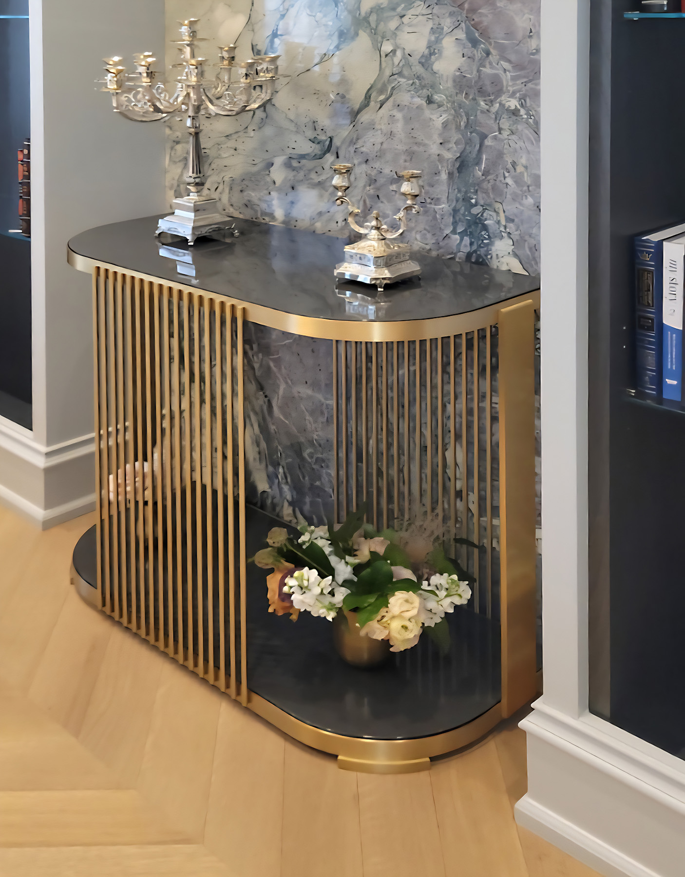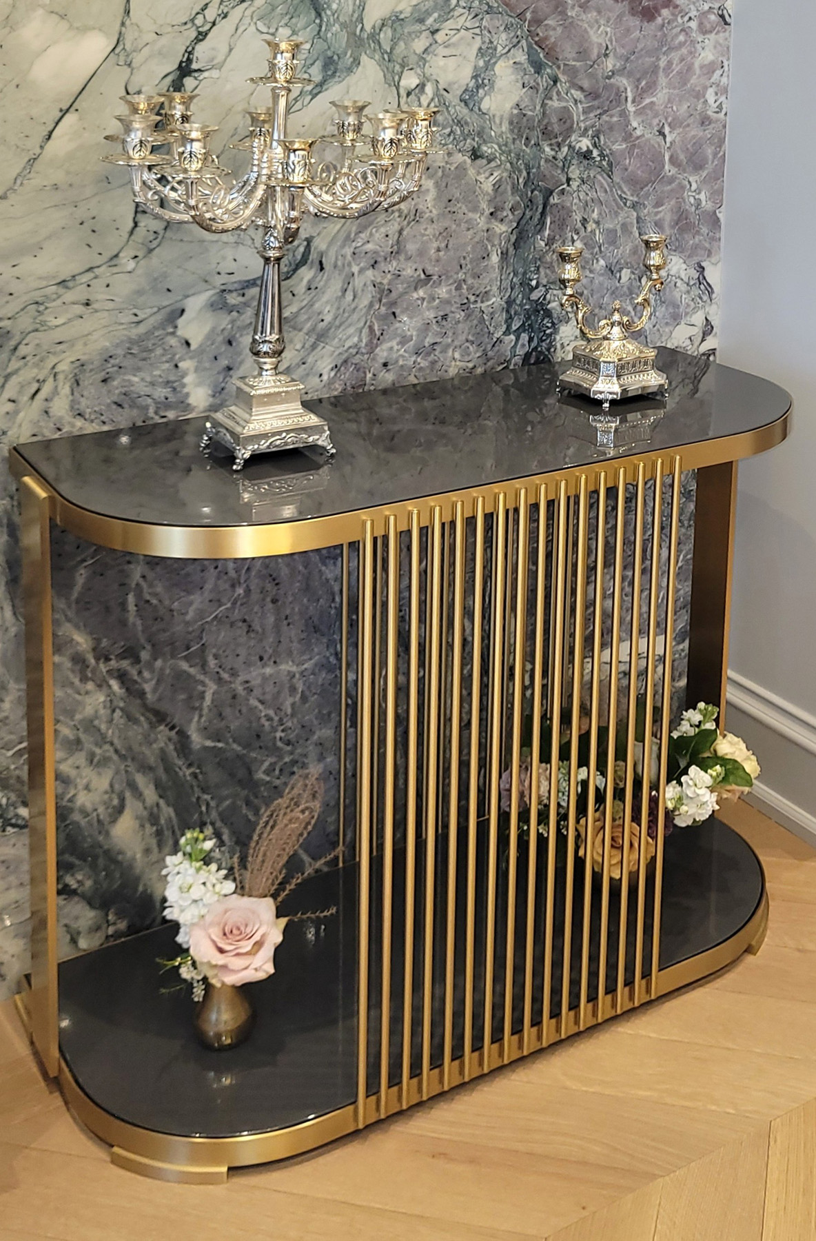 This Open, Radius Corner Two-Level Dining Room Wall Console was Custom Fabricated in Brass and features Two Shelf Surfaces in Reverse Painted Glass.