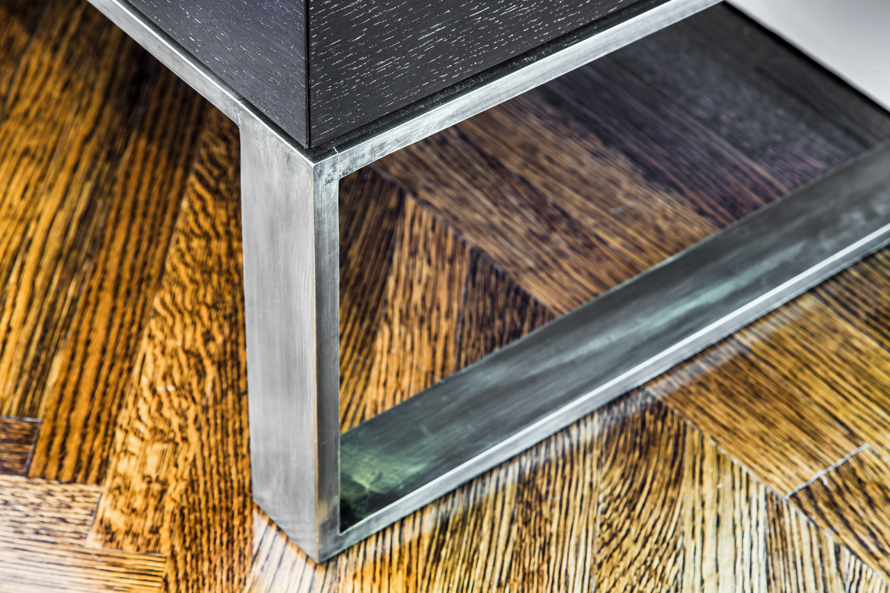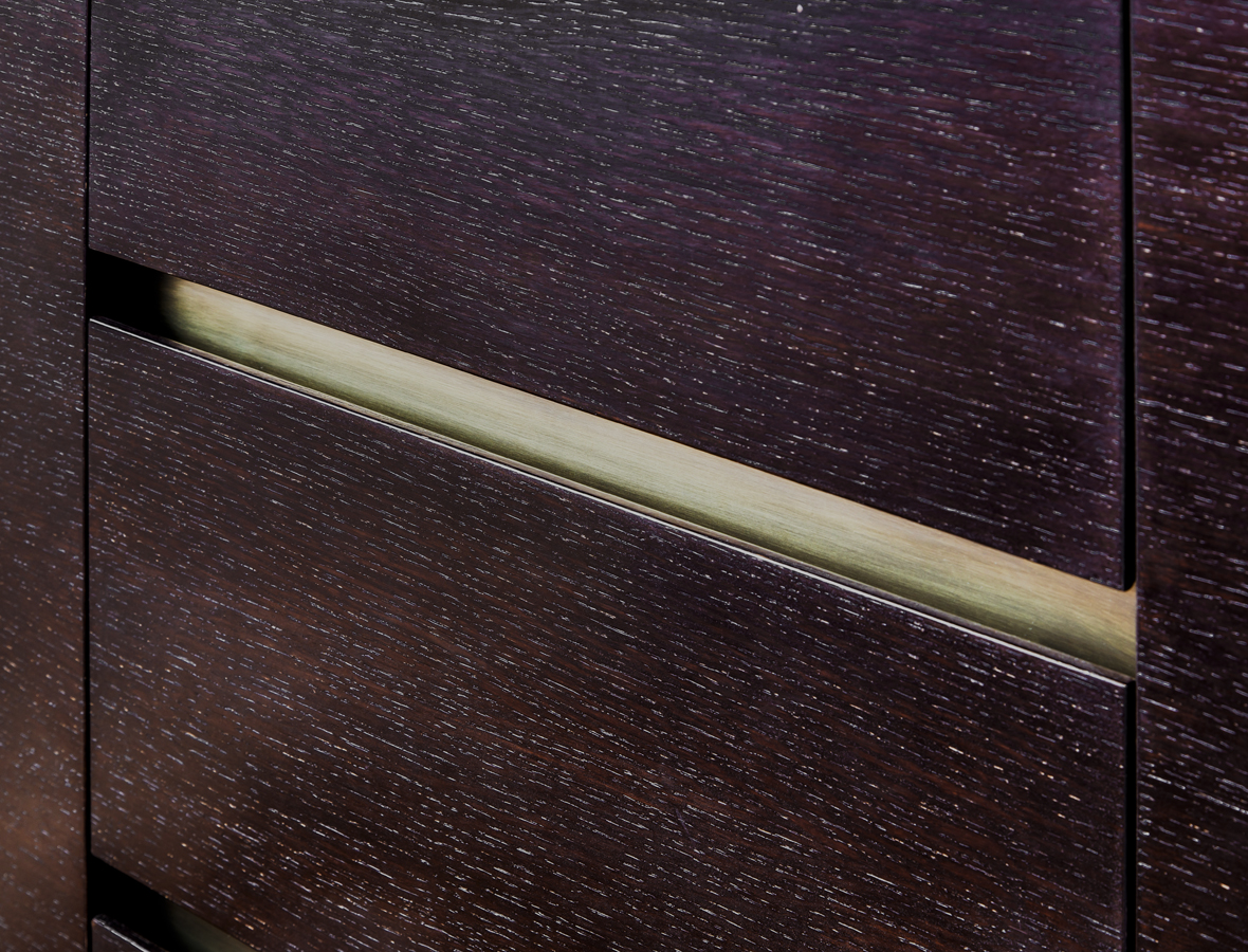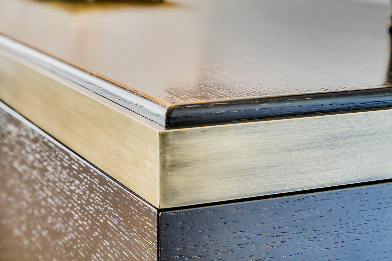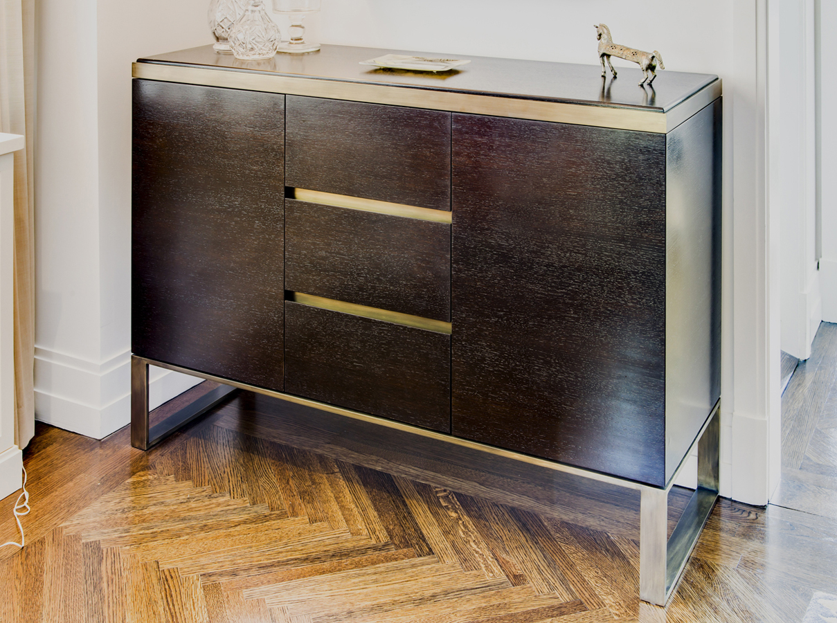 Modern Stained Walnut Buffet with recessed pulls and custom Bronze metal counter trim and base.