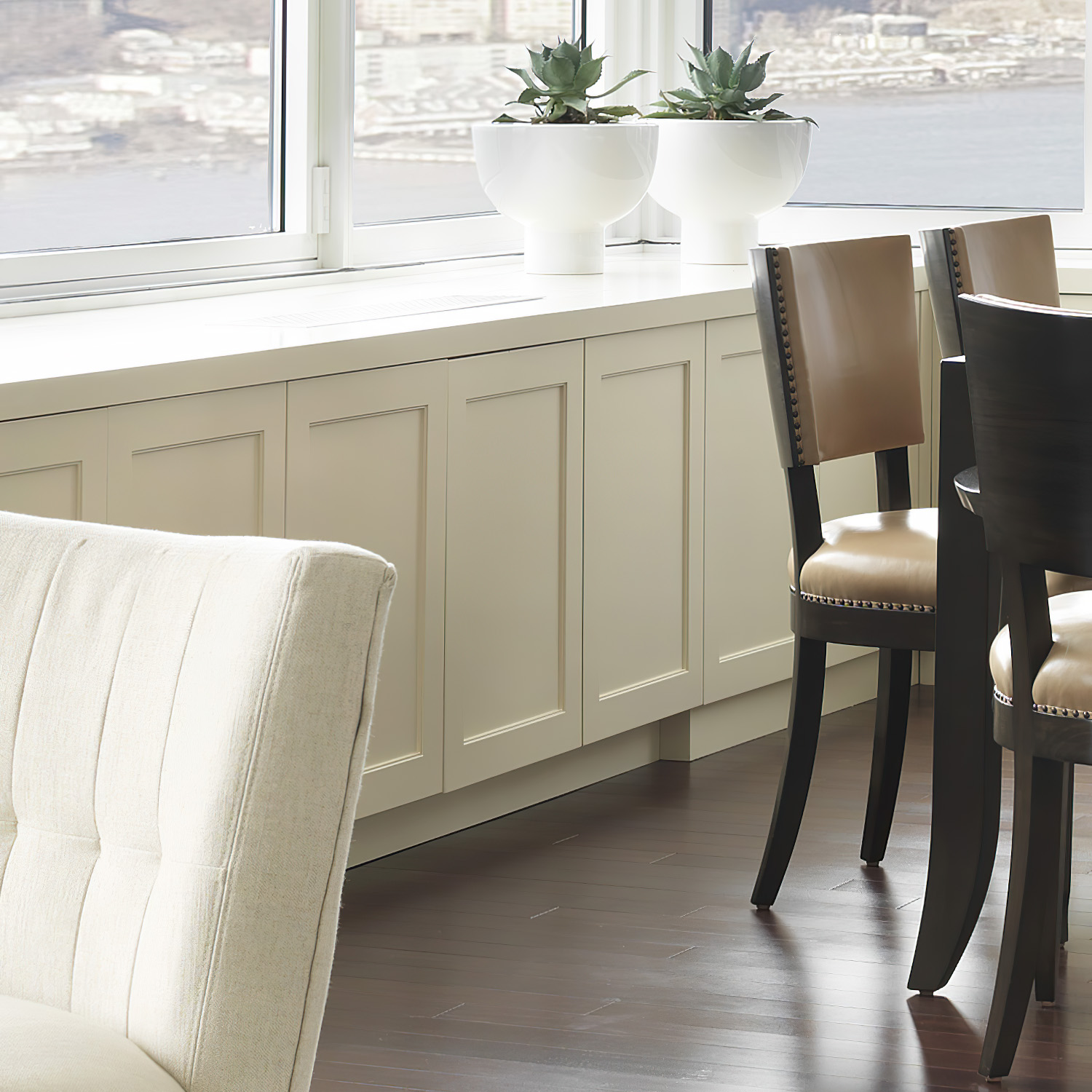 This White Lacquer Shaker Style Window Cabinetry with an Easy Access HVAC Enclosure
