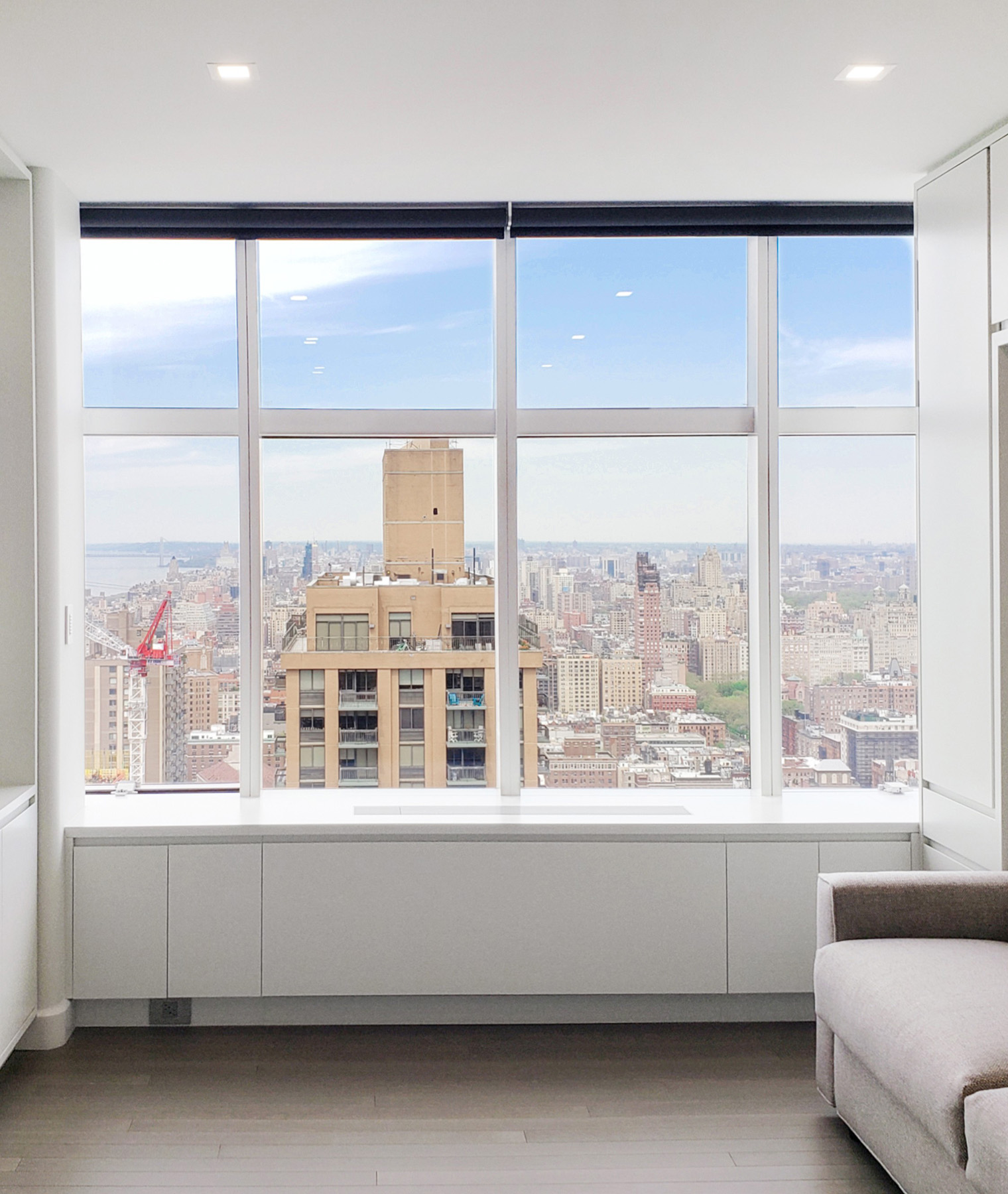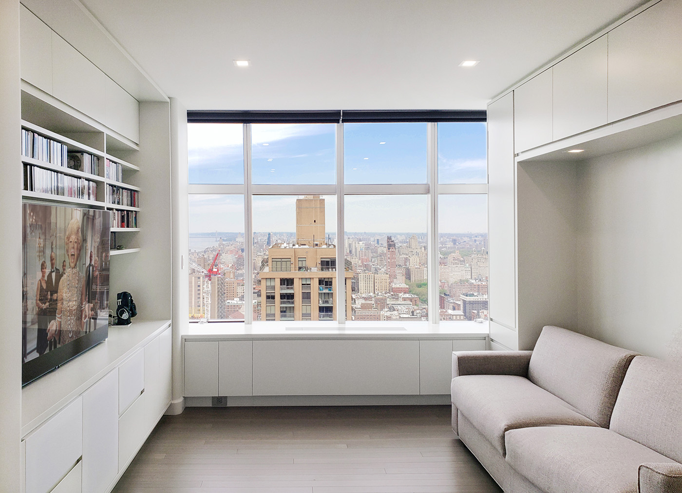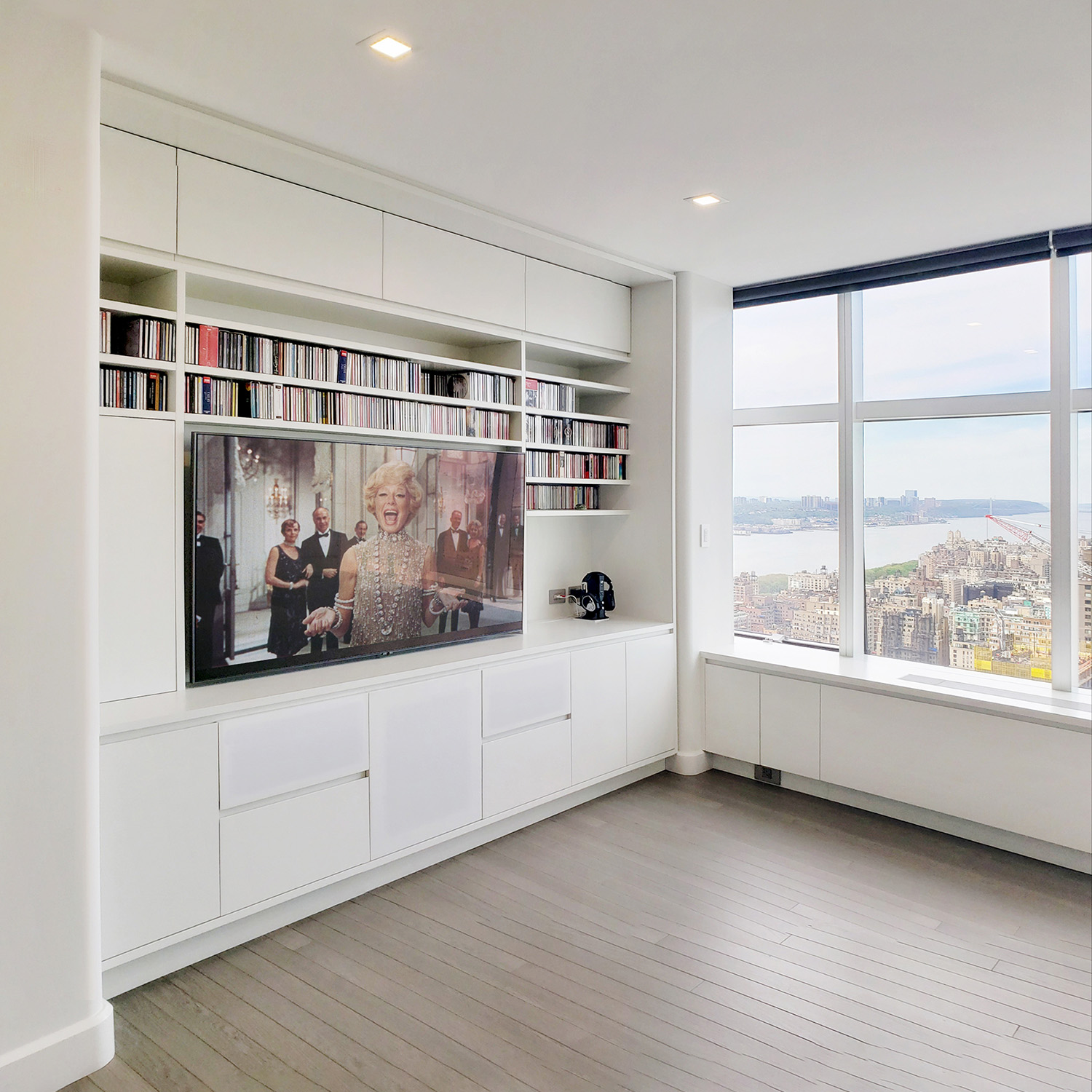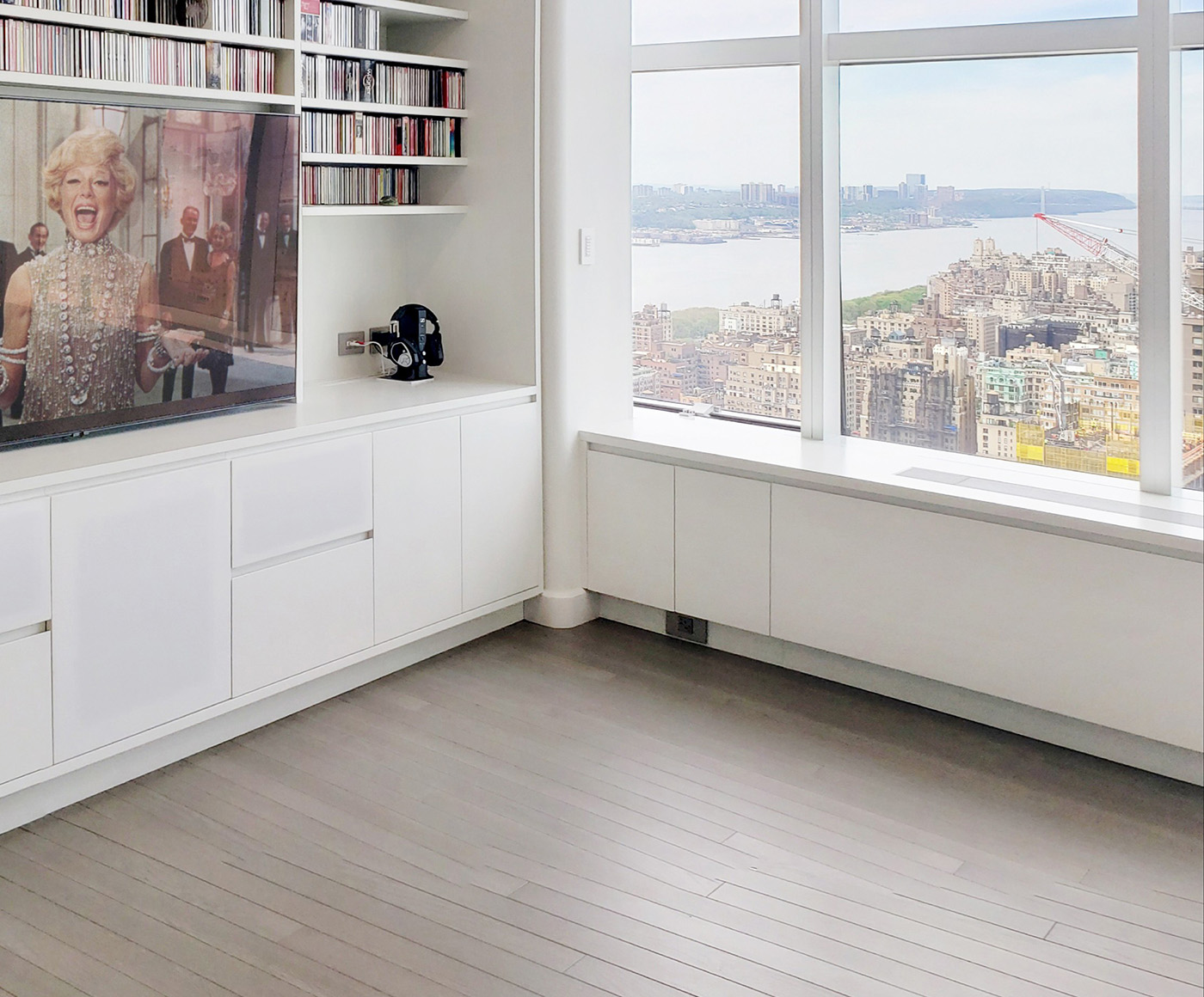 These Modern HVAC Enclosures with Angled Finger Pulls and Side Cabinetry are finished in Satin Lacquer and Installed Seamlessly in this Wrap Around Study-Media Room.
