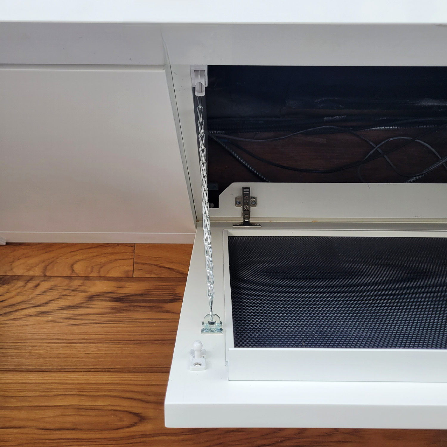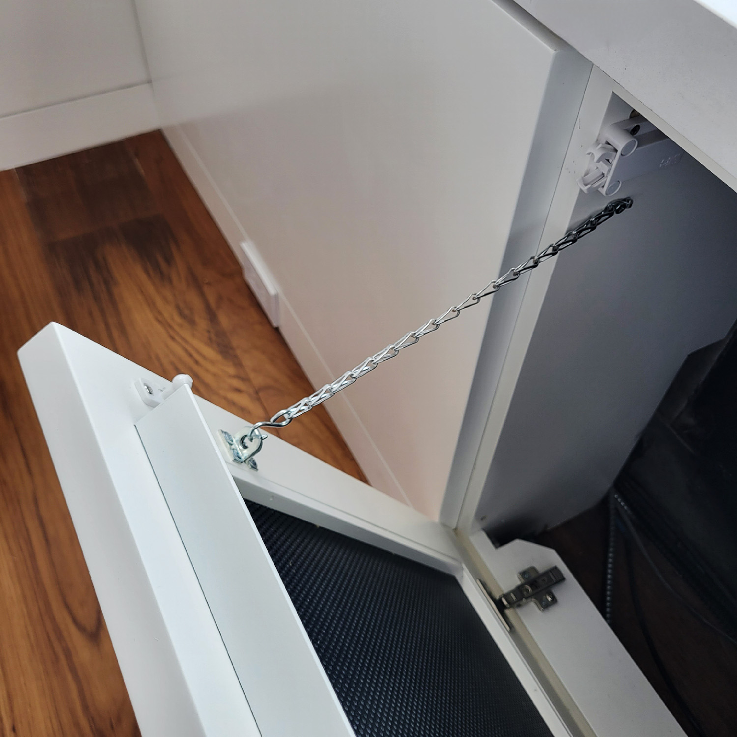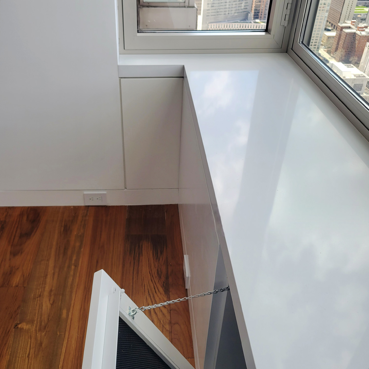 This Clean, Modern Window Cabinetry is installed tight to the window frames and provides storage and a drop-down radiator cover panel with chain supports for safety and a full, perforated Bronze Grill for maximum ventilation. A Quartz Top provides an attractive, strong and practical surface that completes the window millwork.