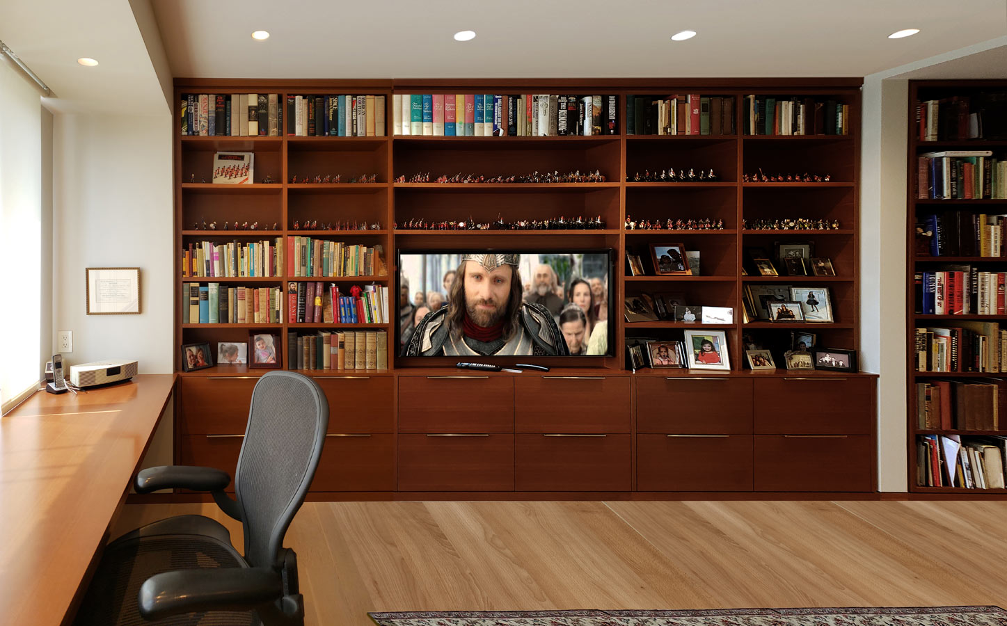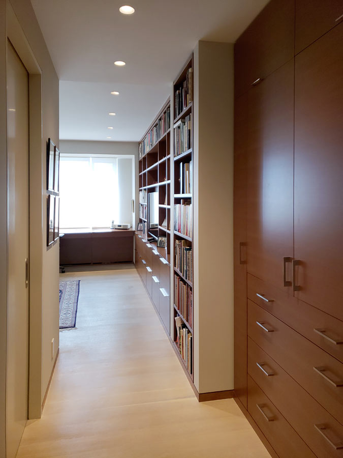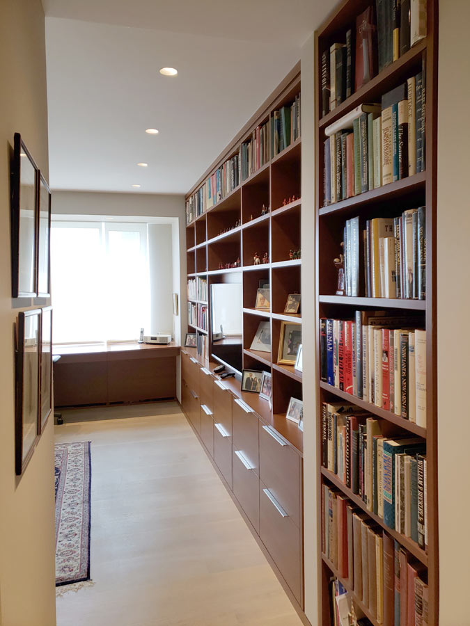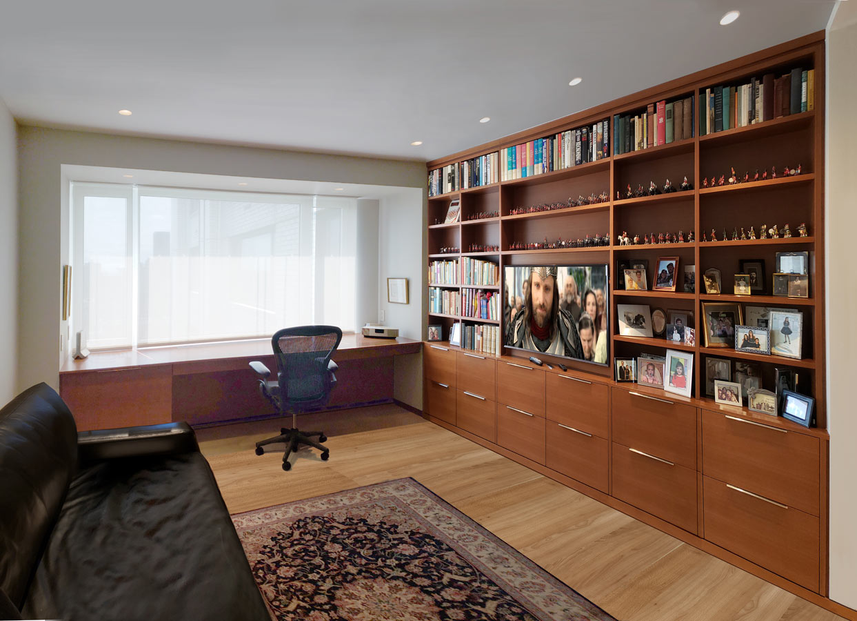 Designed for as private, urban refuge, this highly function, contemporary, built-in study provides ample file drawers, extensive bookcase and display shelving and closed cabinetry, while accommodating a large screen TV.