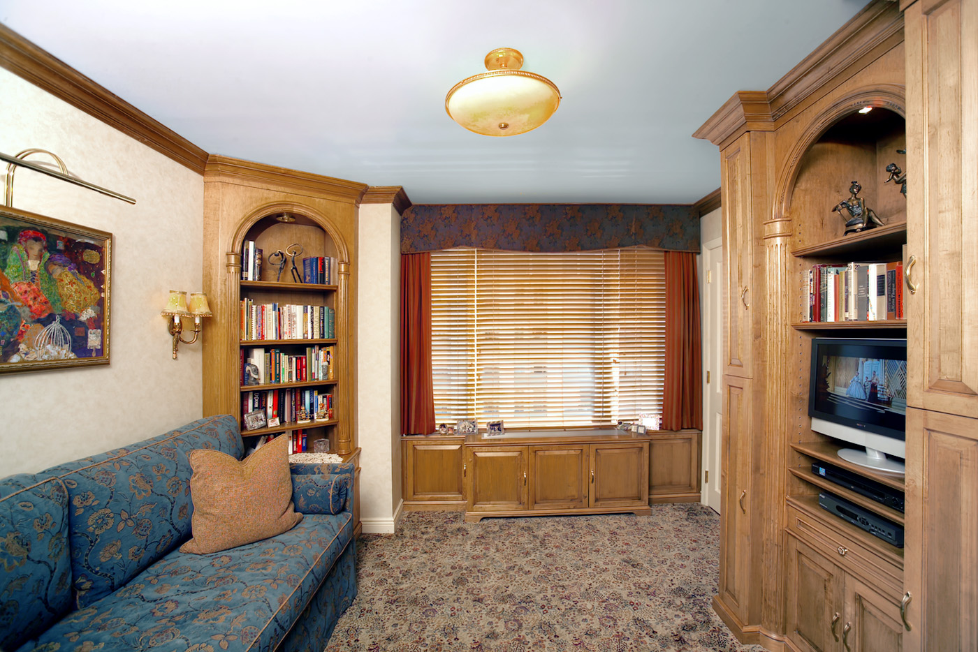 Cozy Traditional Study in stained Maple with corner desk design, and built-in end tables with arched bookcases and fluted half columns.