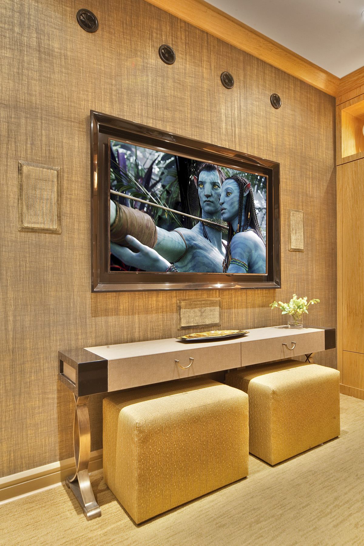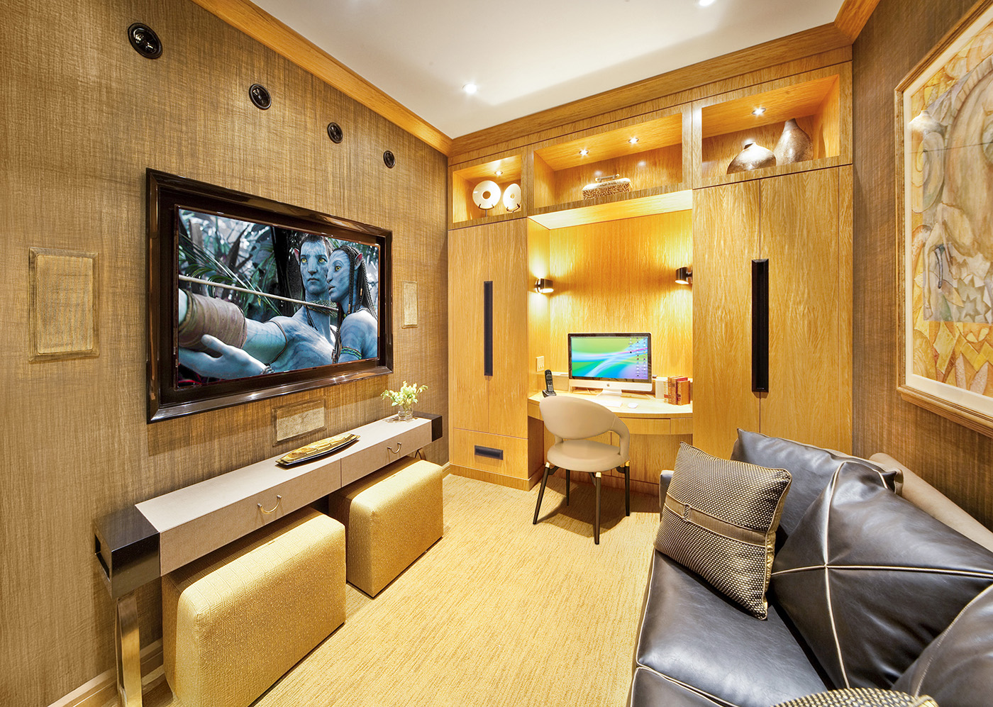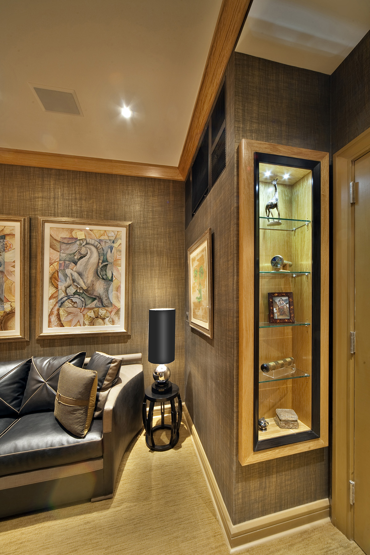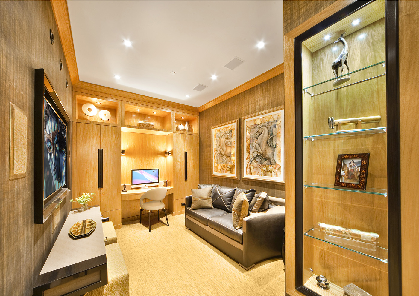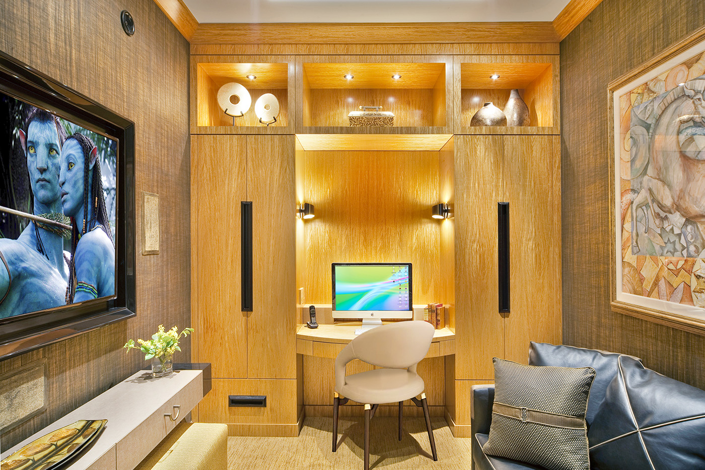 Modern Urban Study in rich Tiger Wood and Ebony, and featuring custom crown molding and handcrafted wall console in Bronze, sharkskin and black lacquer.