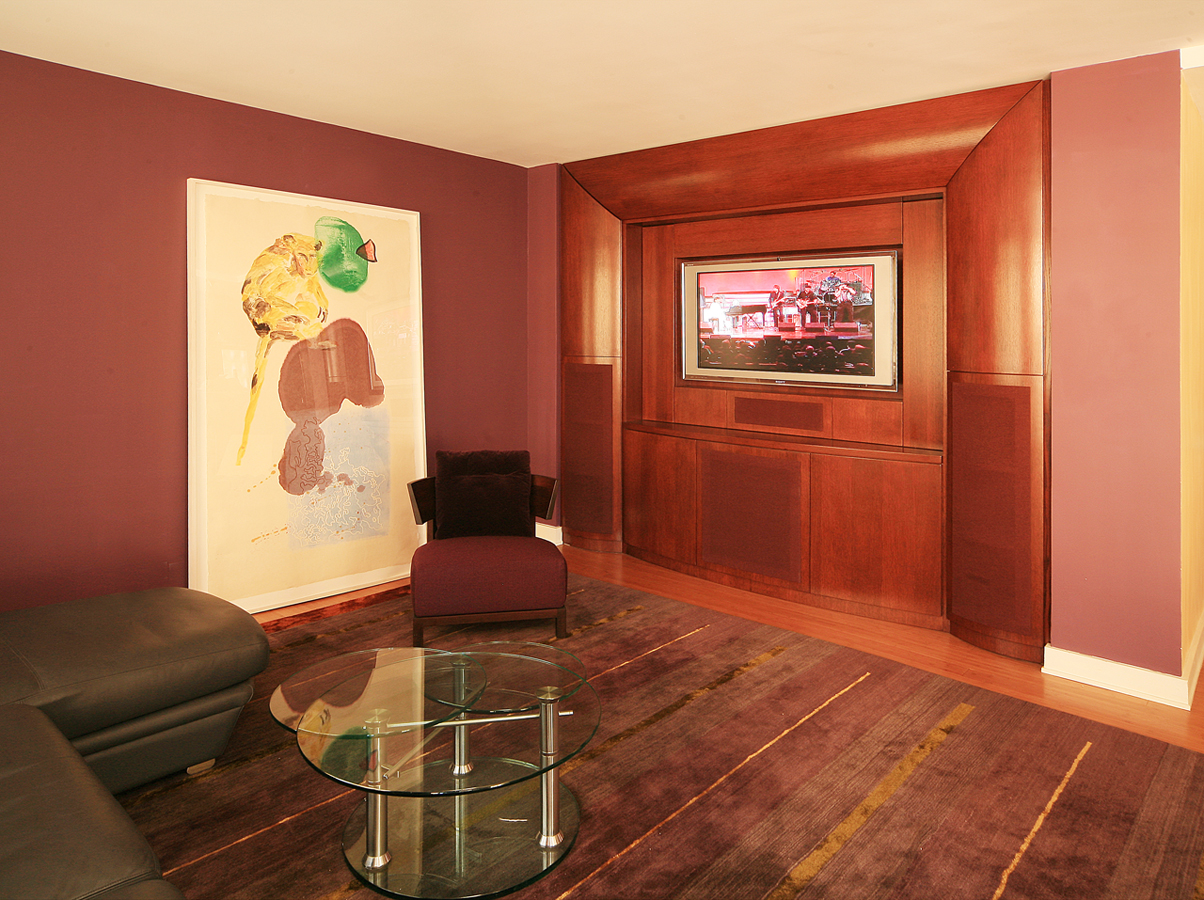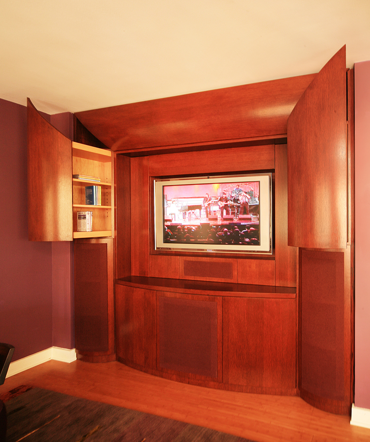 Curved Frame Wall Unit Design in stained Cherry with vertical pull outs, speaker enclosures and recessed TV panel.