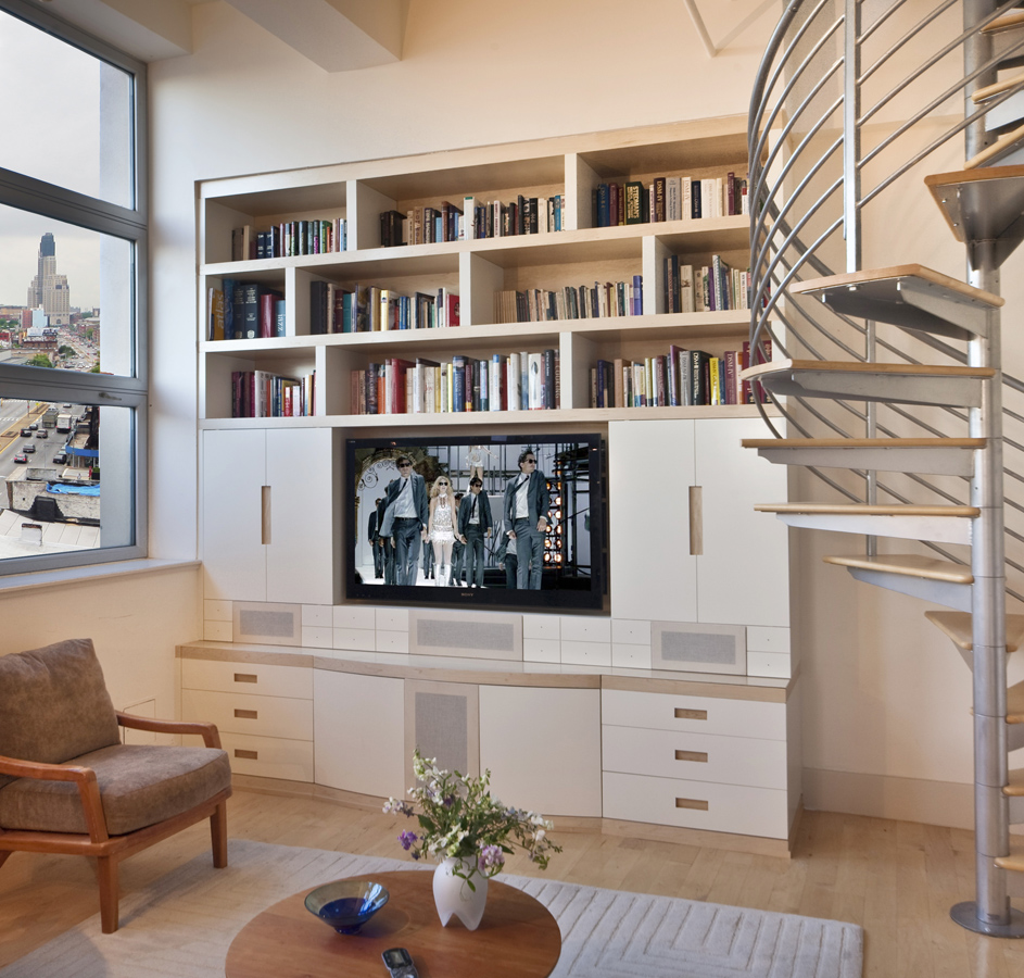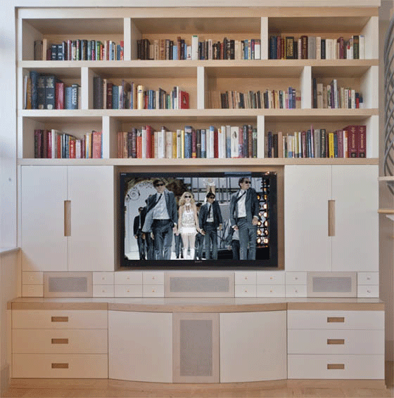 Contemporary Bookcase Entertainment Unit in Natural Maple and satin lacquer featuring acoustic panels and side sliding doors that reveal the TV.