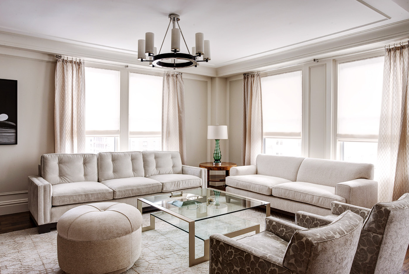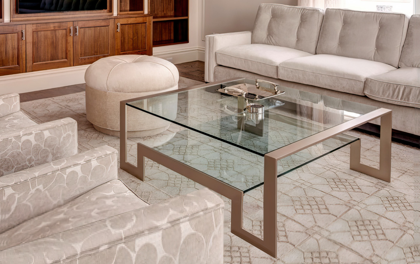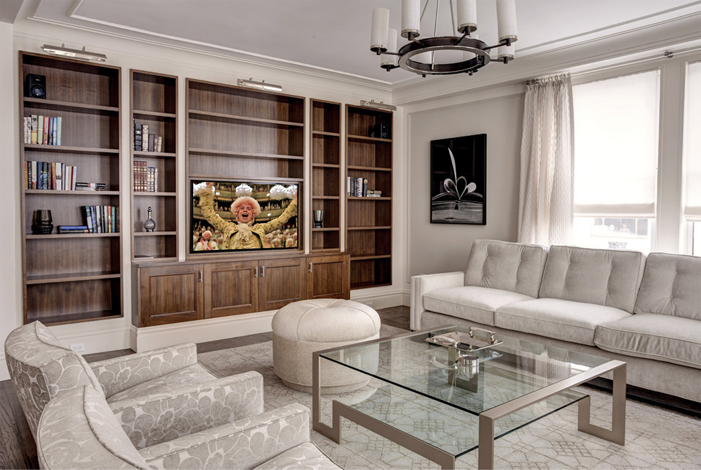 Serenity and Elegance Radiate in this Modern Transitional Living Room with Built-In Custom Walnut Millwork that provides Illuminated Shelving for Books and Display and Central Location for a 60″ TVC comfortably mounted at Eye Level.