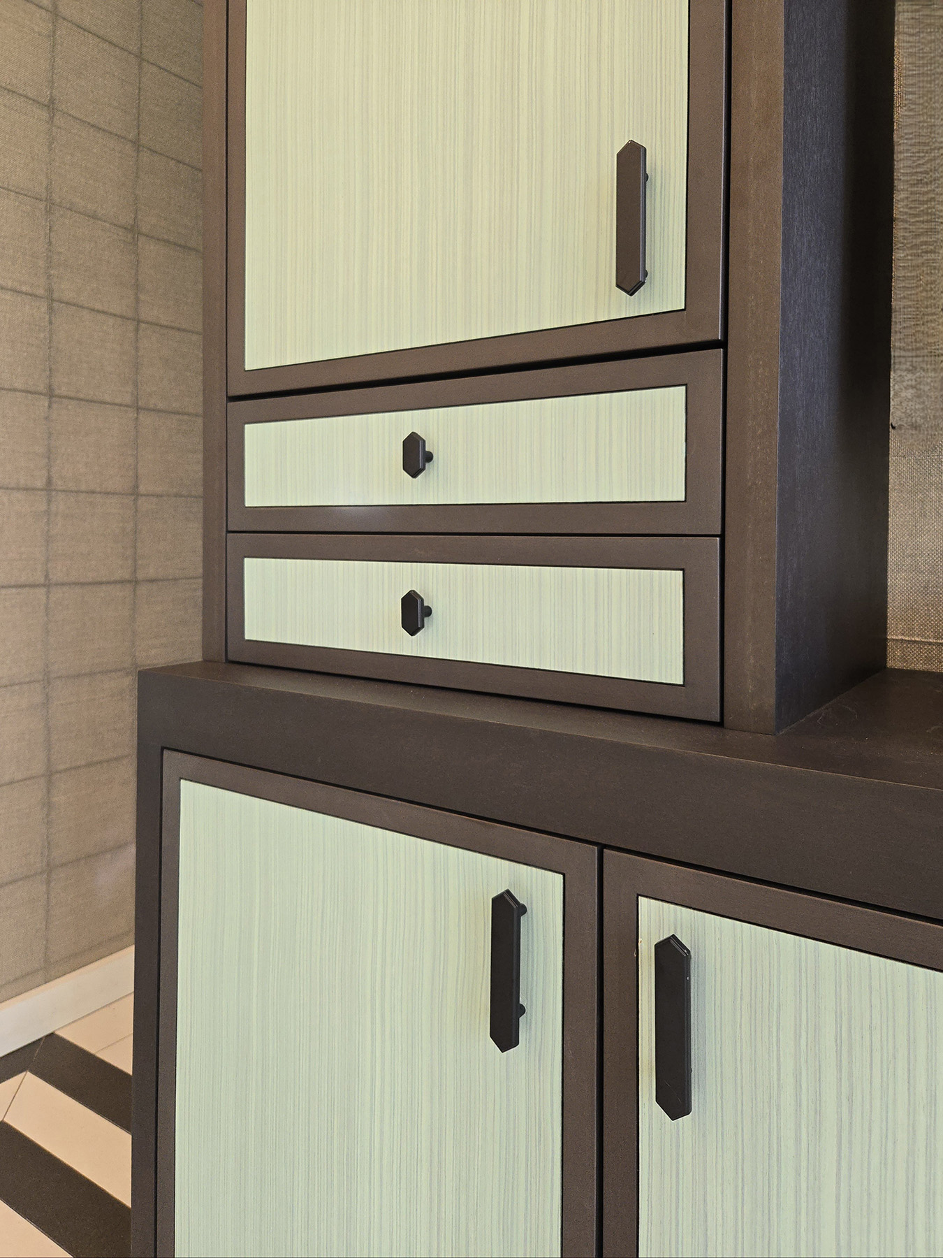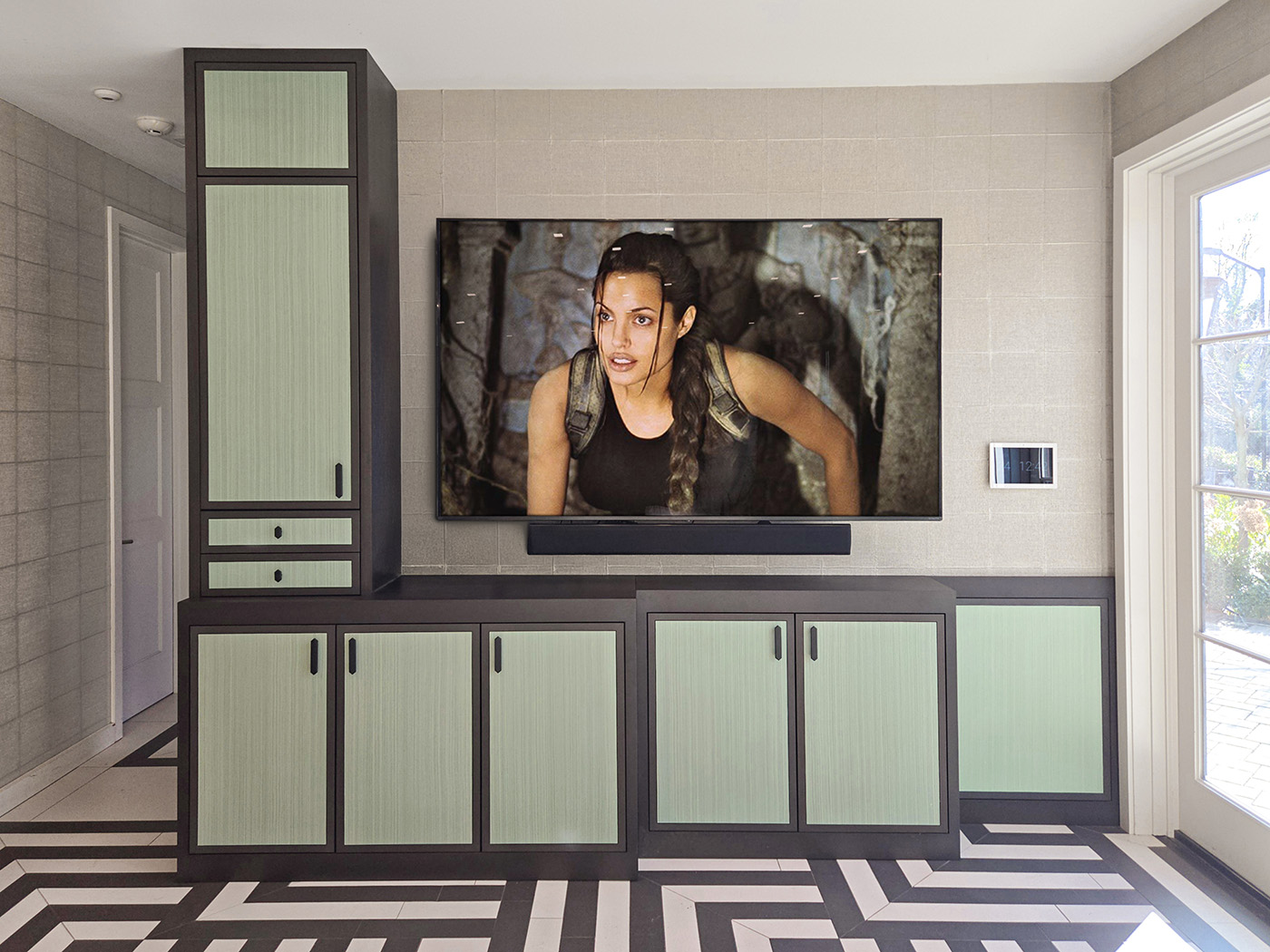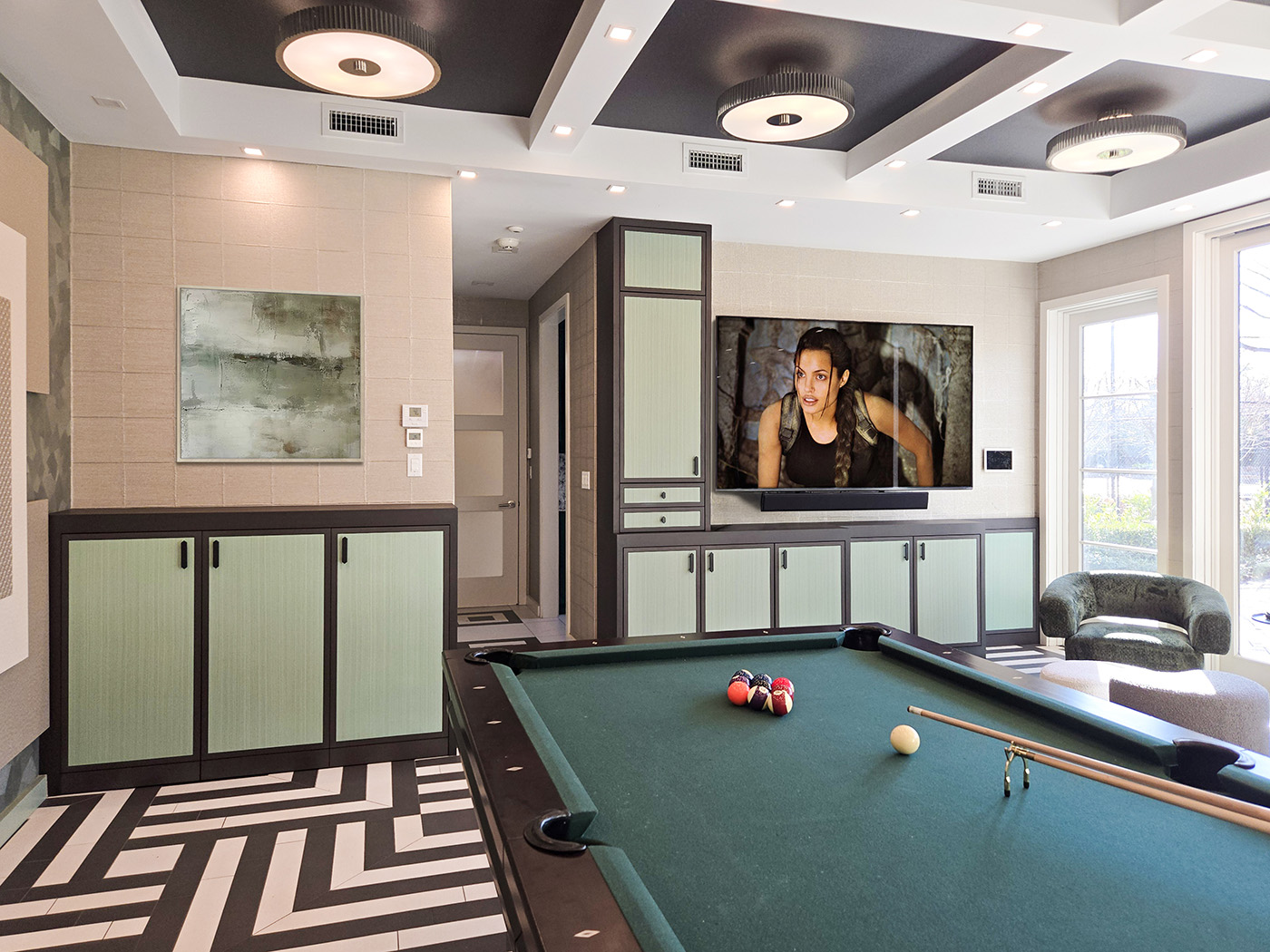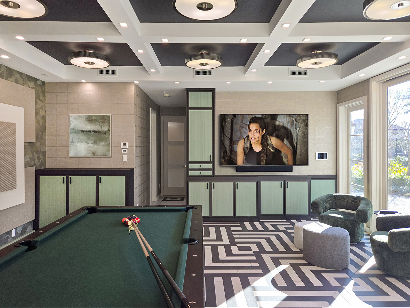The Custom Millwork in this Guest House TV-Billiard Room is fabricated in Espresso-Stained Rift White Oak with Flush Center Panels contrasted with Dyed Zebrawood.