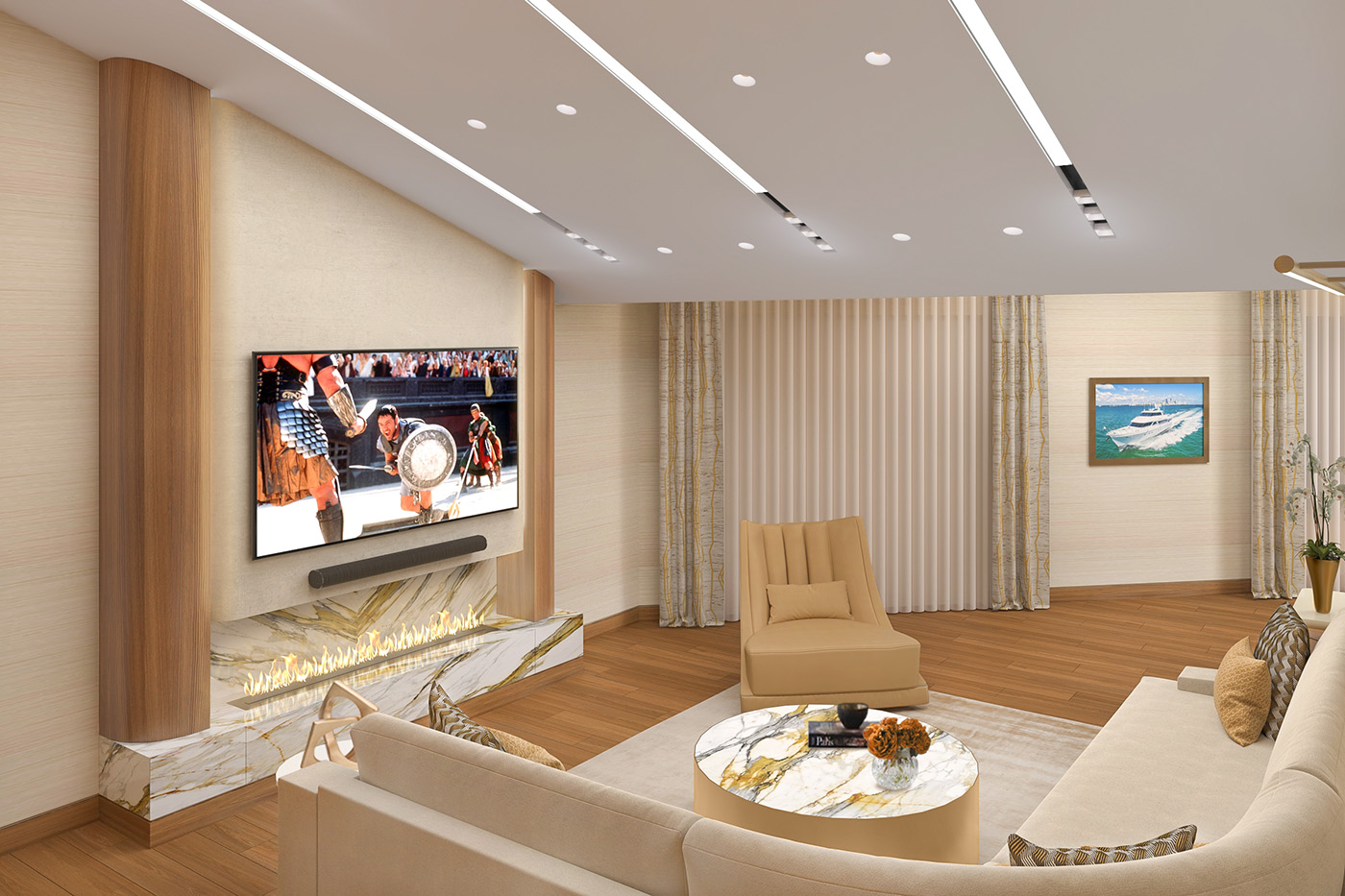 This modern design, impeccably installed to a vaulted ceiling is quite the focal point. Finished in Fumed Larch and Calacatta Gold Porcelain, this exciting piece accommodates an 85″ TV, wall mounted sound bar and a 72″ Bio Flame Linear Alcohol Fireplace. Half-columns in Fumed Larch flank the TV and fireplace and concealed in the base are two storage drawers with porcelain faces as well as an access panel to refuel and service the alcohol fireplace unit.