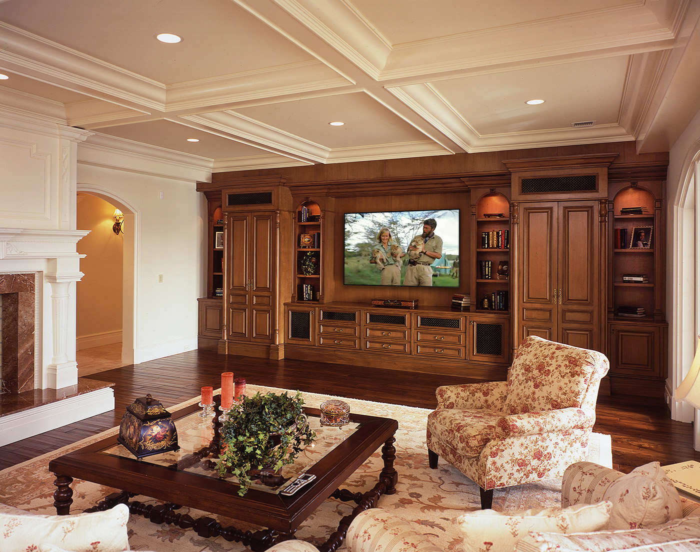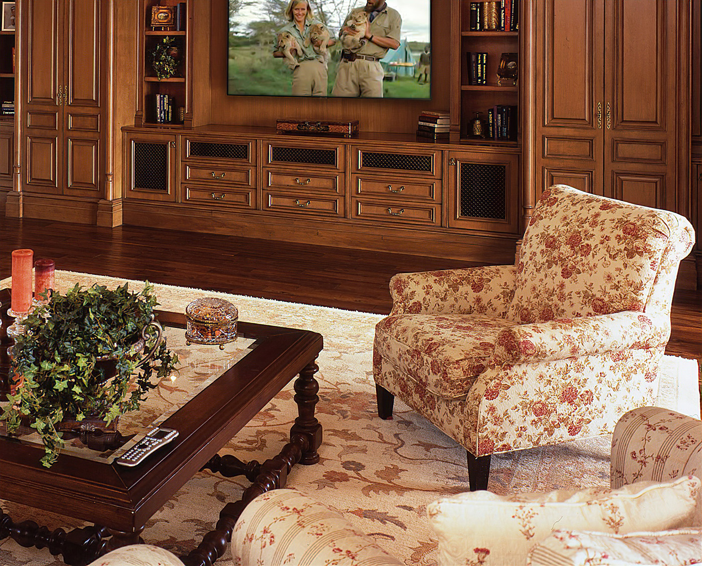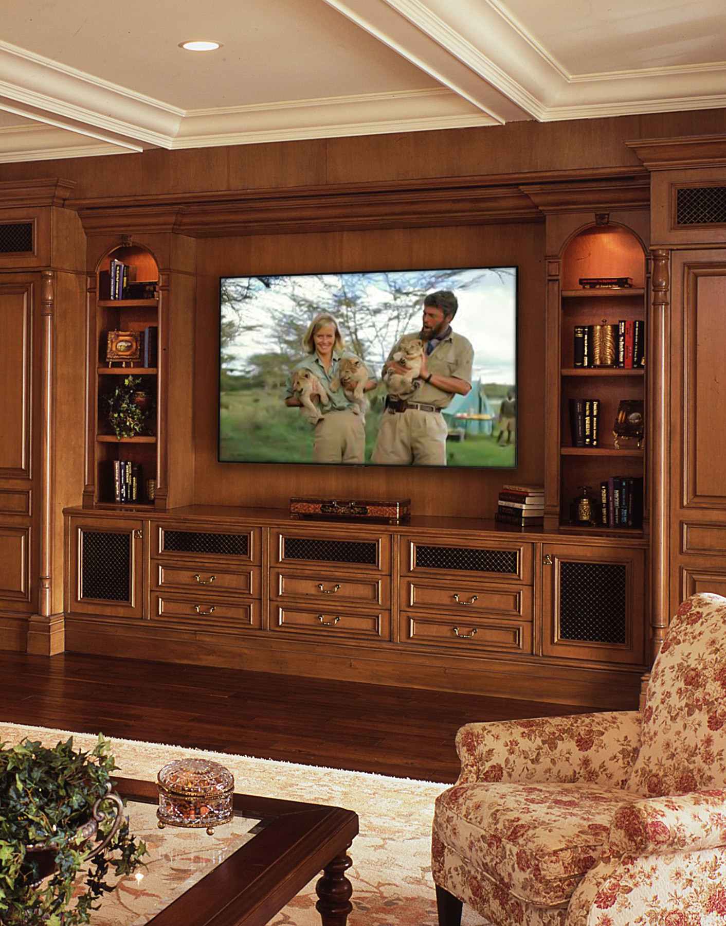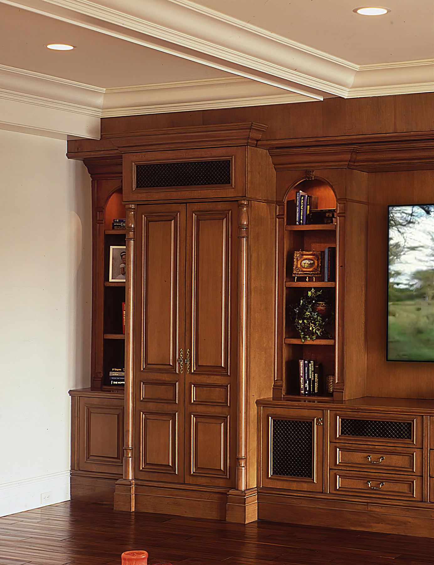 This beautifully appointed traditional living room built-in entertainment unit accommodates a 75″ TV, and houses center and side channel speakers behind acoustic panels. Custom turned columns flank twin, triple raised panel storage units with additional storage is provided with recessed panel center drawers and raised panel side cabinetry. Illuminated, arched display areas with bookshelves beneath add openness and elegance to this fine custom piece.