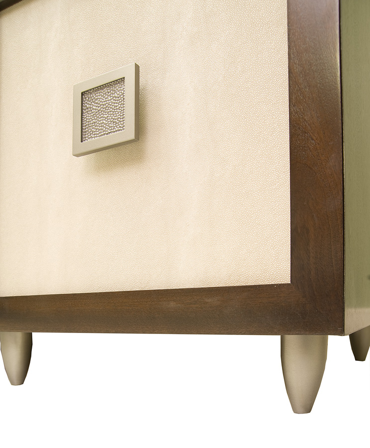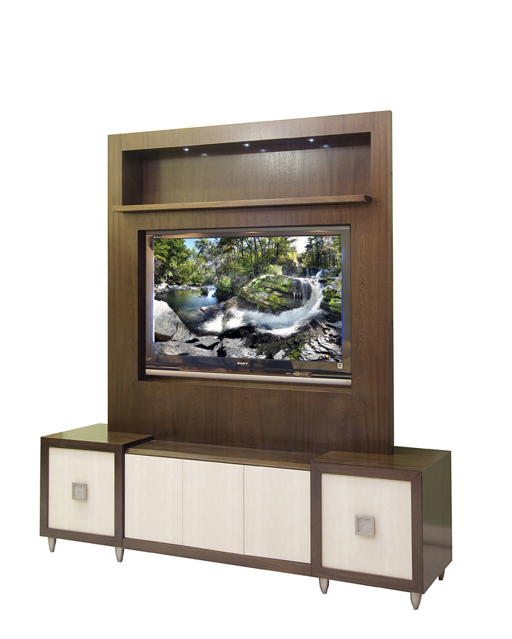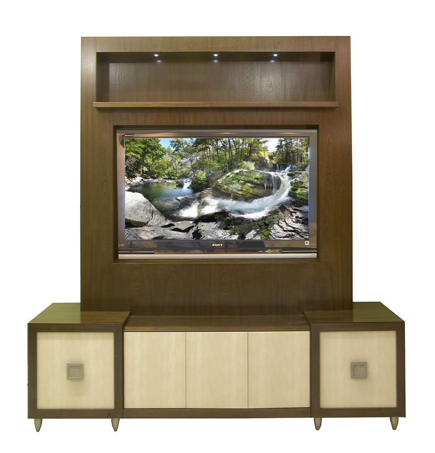 Walnut and Shagreen TV Unit with custom metal handles and feet with recessed TV section, display and cabinet storage.